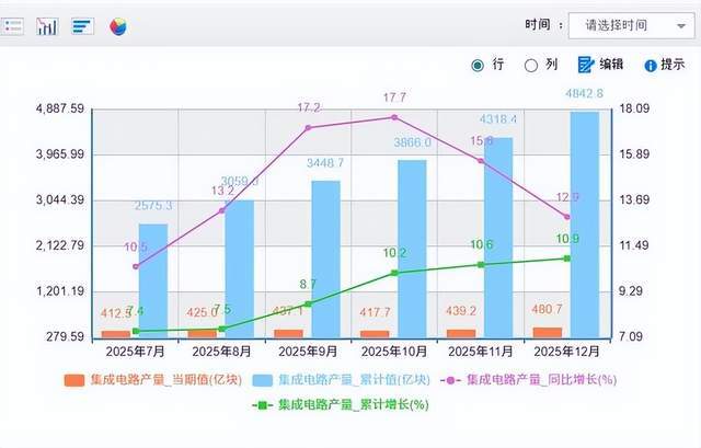 近日,国家统计局发布了2025年国内集成电路的产量情况(芯片),我们可以看到,2025年,中国芯片产能又创新高了。